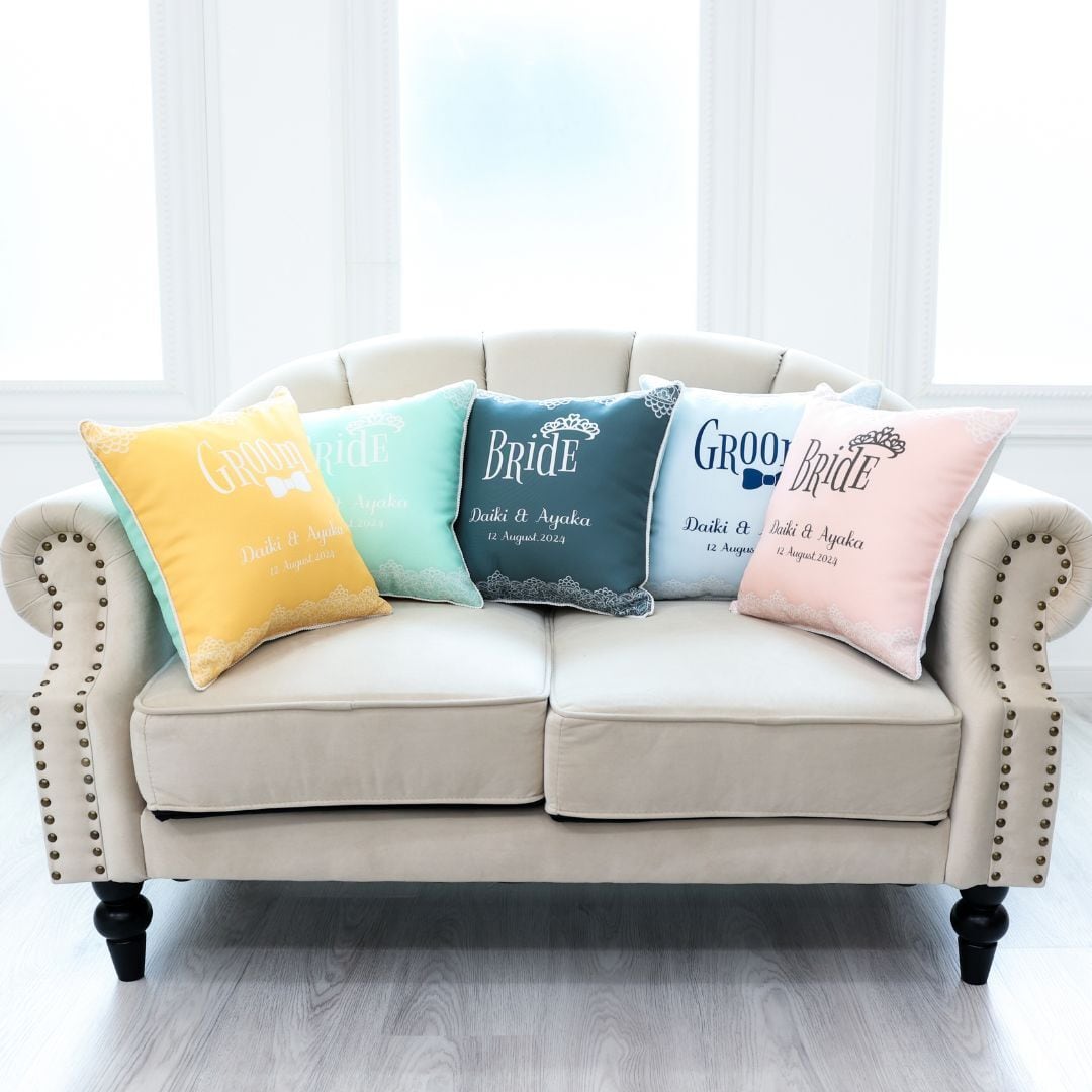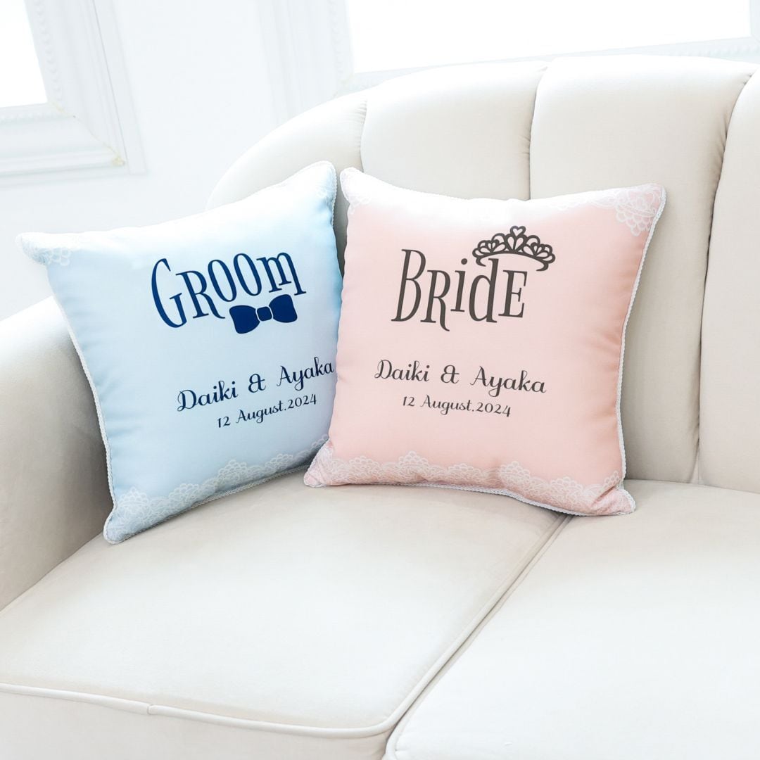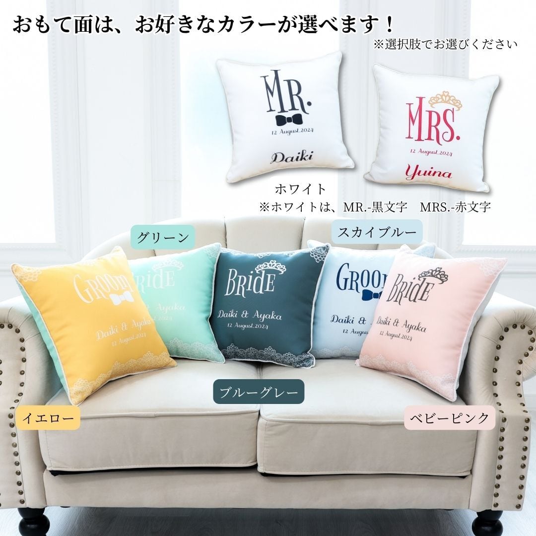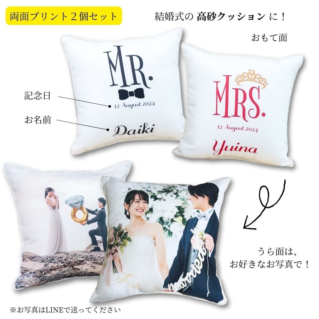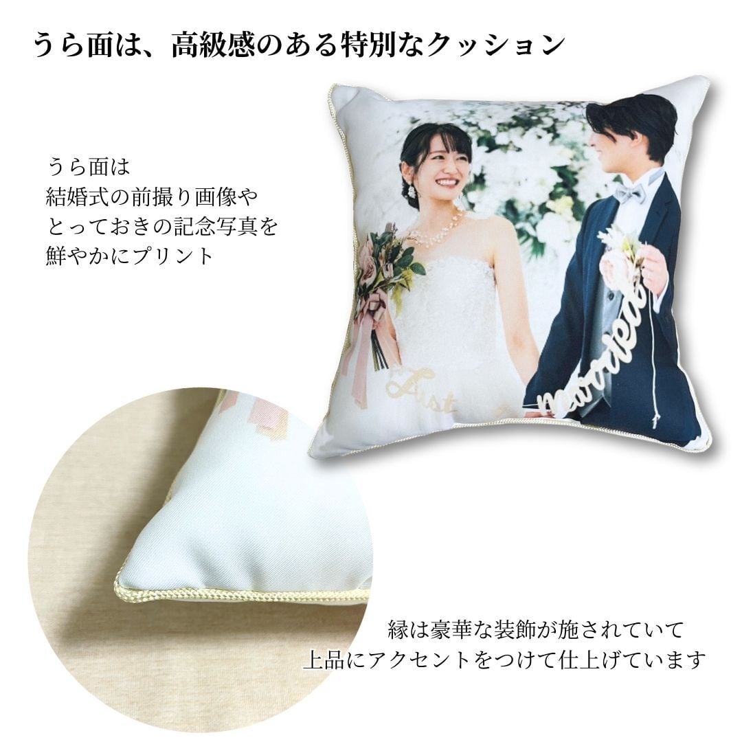 おもて面は、高砂クッションとして、お二人のお名前と記念日が入れられます