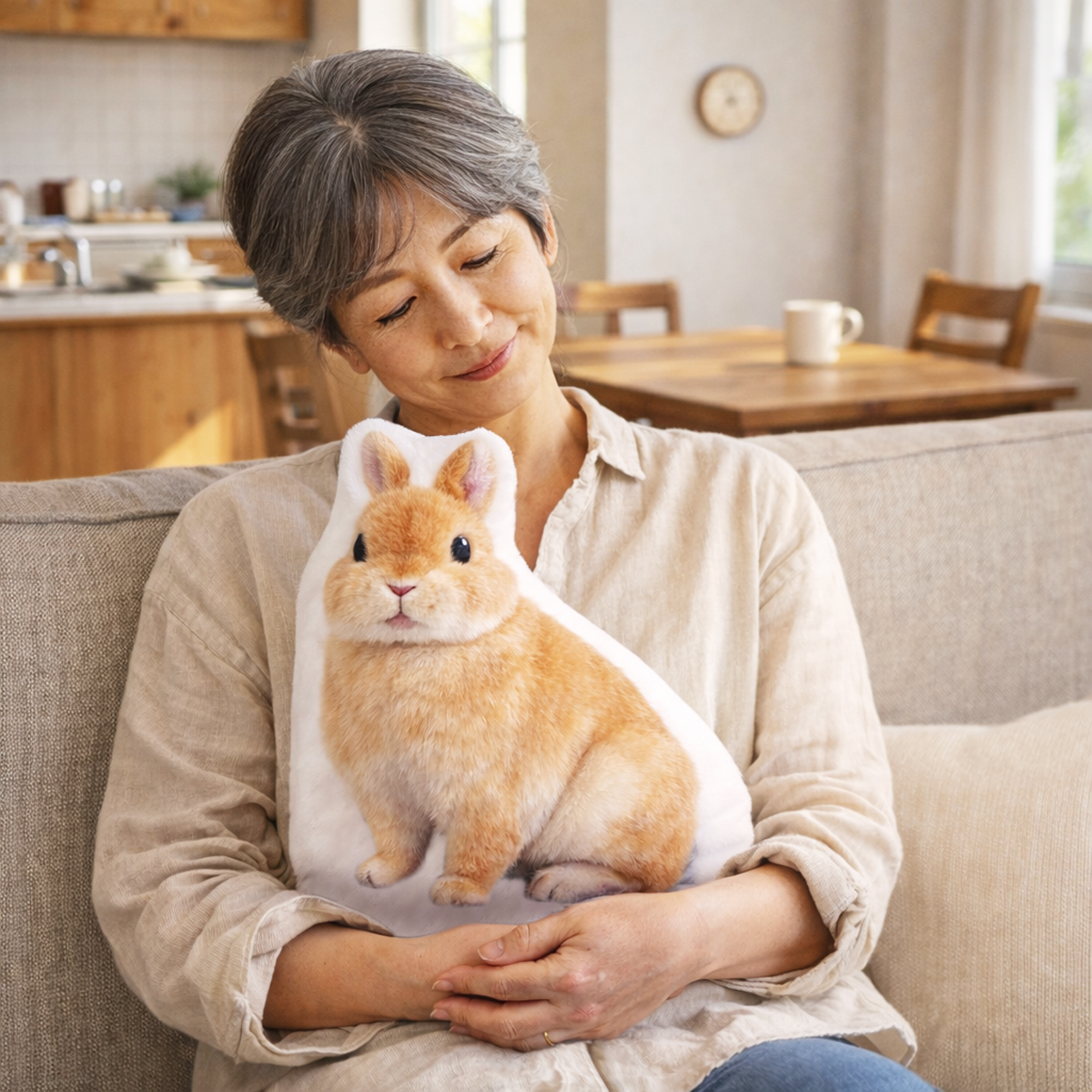 素材にもこだわったクッションは、ちょうど「膝の上で抱きしめる」のに最適なサイズ感に調整しています。
